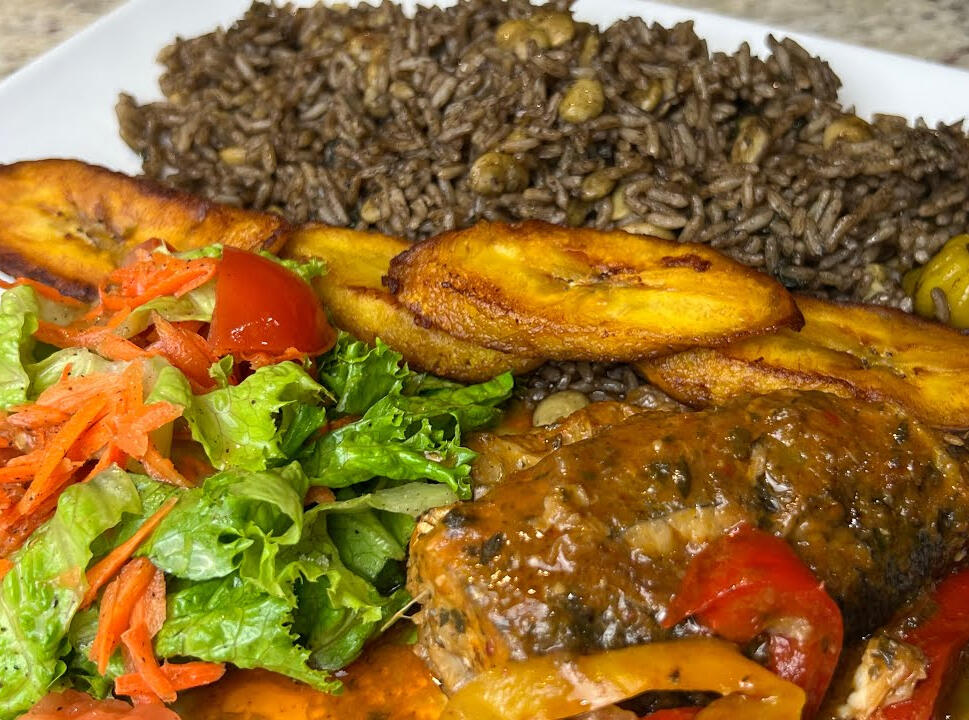 Haitian red snapper is a flavorful, pan-fried fish seasoned with garlic, lime, and spices, served alongside Haitian black rice and crispy fried plantains for a deliciously vibrant and balanced meal.