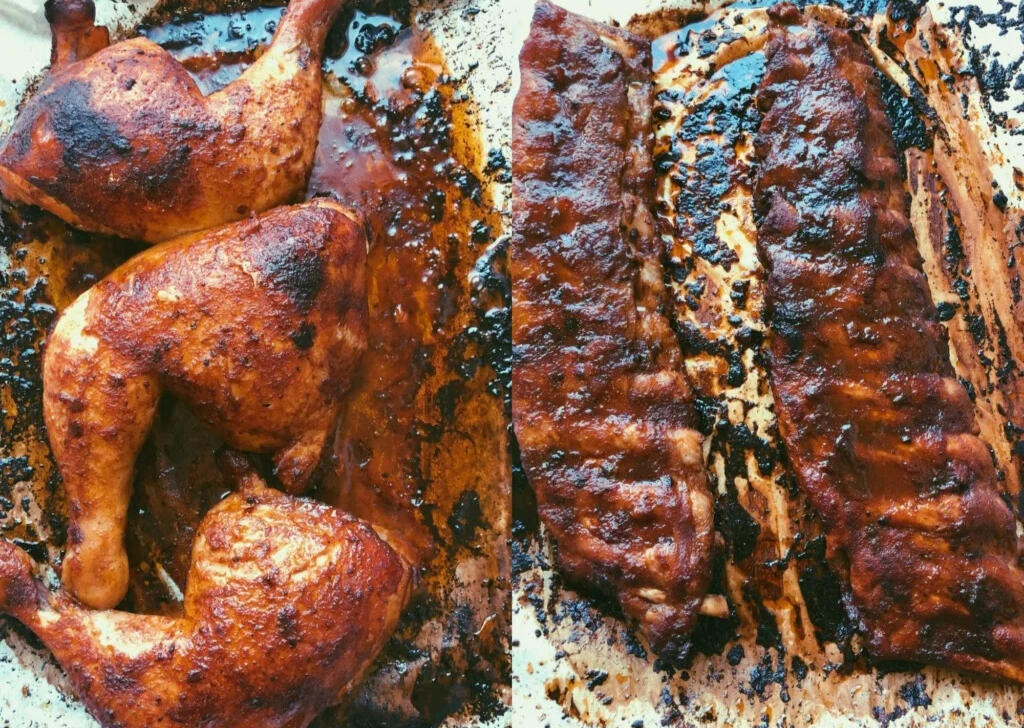 American BBQ chicken and ribs are smoky, tender cuts of chicken and pork slathered in a flavorful, tangy barbecue sauce, often grilled or slow-cooked to perfection over wood or charcoal.